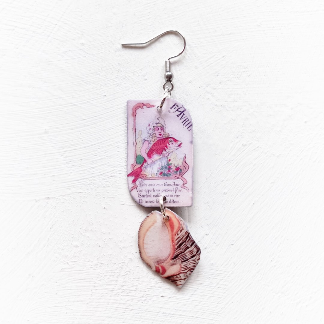 Lovingly designed and created by hand, with stainless steel findings. Dangling collage elements measure 2cm in width and around 7.5cm in length; 9.5cm total length with ear hooks included. 🧜🏻♀️